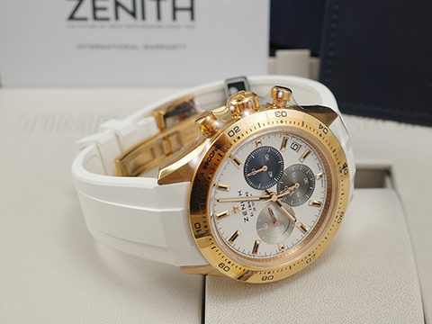 CHRONOMASTER Sport腕錶結合白色三色錶盤、泵式按鈕等ZENITH計時腕錶的經典元素,搭配整合式白色FKM橡膠錶帶和充滿現代風格的41毫米18K玫瑰金錶殼。腕錶搭載El Primero 3600 1/10秒自動計時機芯。