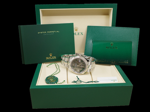 18K白金三角坑紋錶框 / 三板蠔式錶帶 / 904L不鏽鋼材質錶殼、錶帶、摺疊扣、旋入式錶冠 / 綠色羅馬時標 / 銀灰色面盤 / 夜光指針 / 藍寶石水晶玻璃 / 防偽內圈 |
