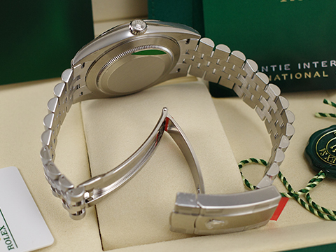 18K白金三角坑紋錶框 / 18K白金羅馬時標 / 904L不鏽鋼材質錶殼、紀念型(Jubilee),五格鏈節錶帶、摺疊扣、旋入式錶冠 / 夜光指針 / 藍寶石水晶玻璃鏡面 / 防偽內圈 |