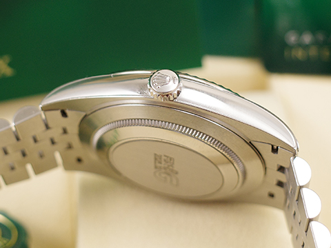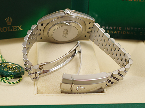 而底蓋上可見的坑紋設計亦出於同樣目的,並以特定的勞力士工具旋緊於錶殼。及後,三角坑紋演變為一項美學設計元素,堪為勞力士的經典特色。時至今日,三角坑紋成為品牌腕錶的特色,這款Datejust 41的外圈以金製成。