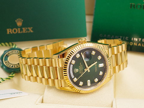 | ROLEX 勞力士 Day-Date 128238 128238-0069 蠔式 日期星期型 黃K金材質 煙燻綠 綠面 原鑲鑽石時標 經典元首型錶帶 2023保單 已包膜 |