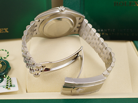 904L不鏽鋼材質錶殼、五格鏈節錶帶款 Jubilee錶帶、摺疊扣、旋入式錶冠 / 白金羅馬時標 / 藍寶石水晶玻璃 / 防偽內圈 |