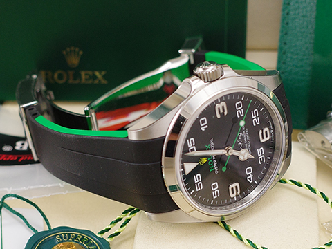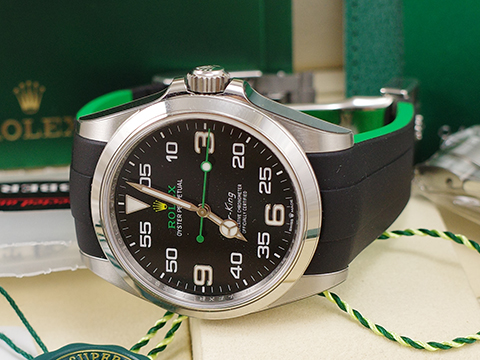 勞力士的「Air-King空中霸王」,是屬於勞力士蠔式恆動的入門系列,只有最基礎的大三針功能,連日曆都沒有,價位上也最為平易近人。這個系列曾經是勞力士最久遠的系列,最早可追溯到1930年代就開始生產的飛行錶。不過,隨著時代的演進,後來的Air-King空中霸王的尺寸(34mm)以現代男錶來說嫌太小,而且與Exploer探險家定位相當接近。所以在2014年,勞力士開始以Oyster Perpetual 蠔式恆動的面盤字樣取代成為新入門系列,除去了Air-King的標誌,讓人以為Air-King 空中霸王系列已經正式走入歷史了。 2016年勞力士幫Air-King重新定位。 全新的Air-King錶款,尺寸增大成為40mm,比起探險家(39mm)還要大一點。它的面盤融合了Exploer的3、6、9數字,同時又加上飛行軍錶採用的5分鐘單位數字,而鮮綠色的秒針與品牌logo,配上鮮黃色的皇冠,則讓整個面盤跳了起來。