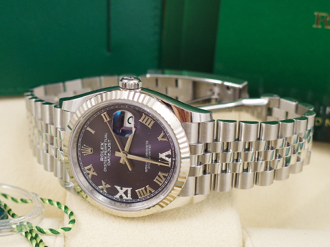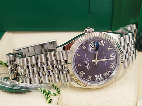 | ROLEX 勞力士 Datejust Jubilee 126234 126234-0021 蠔式日誌型 五格鏈節紀念型錶帶款 茄紫色面盤 原廠VI、IX鑲鑽 羅馬時標 自動上鍊 2023保單 |